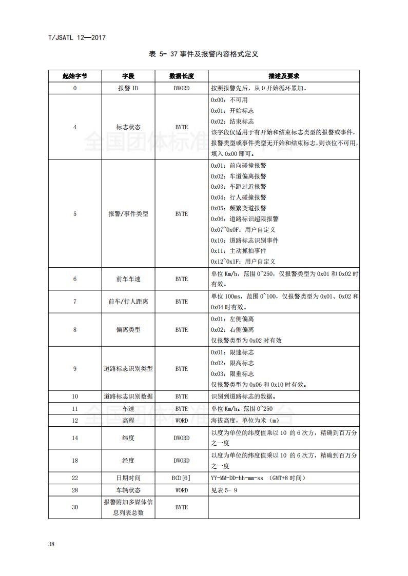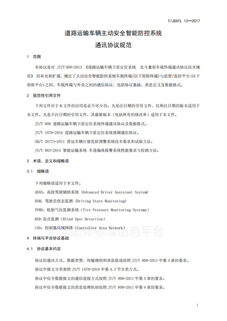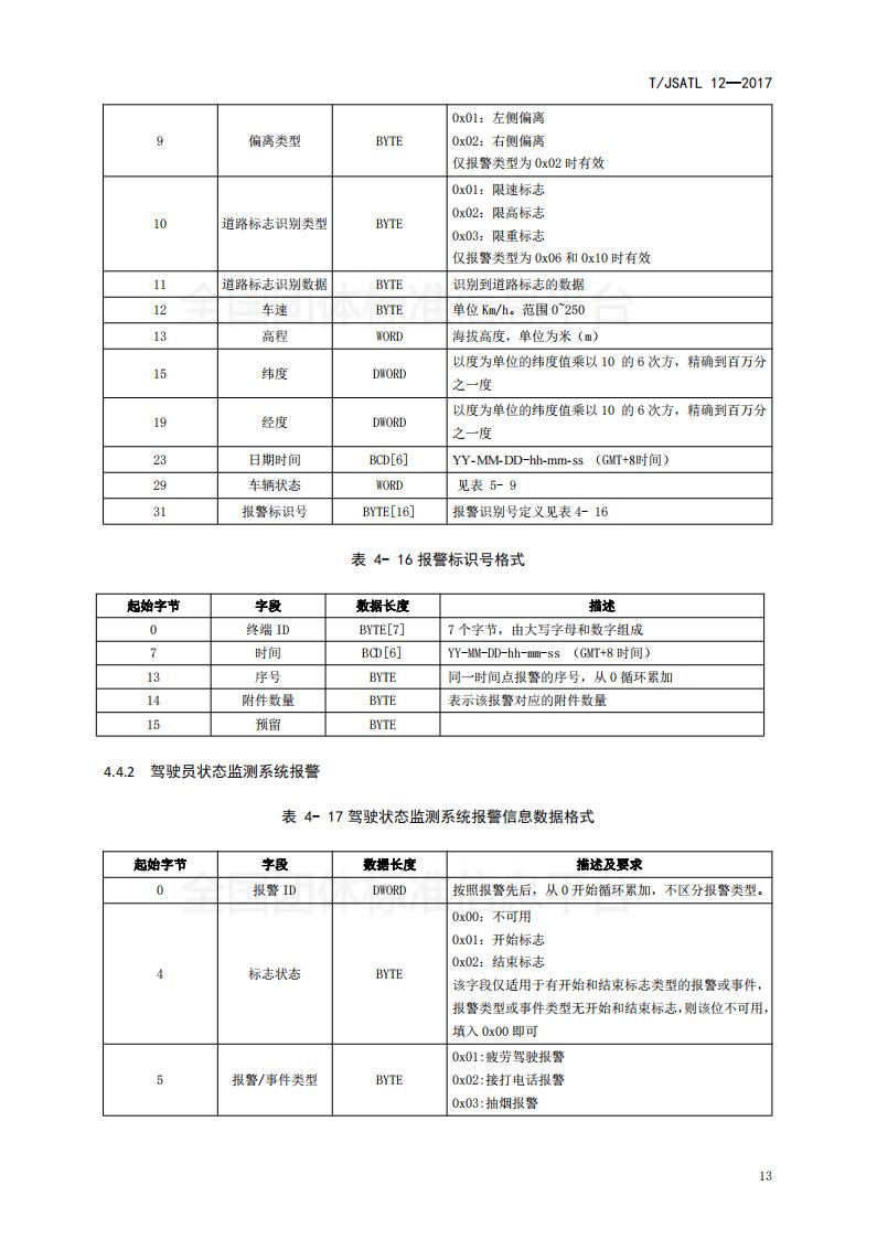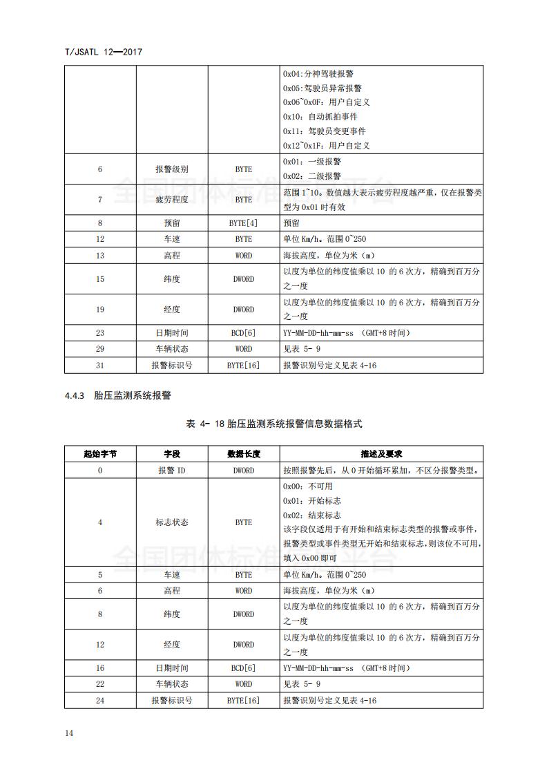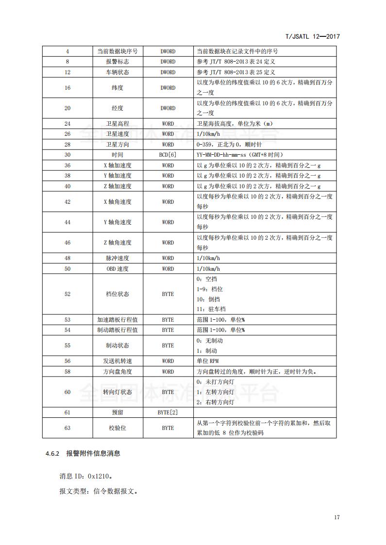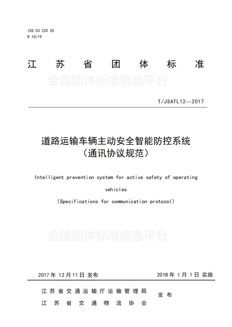 江蘇省 TJSATL 12-2017 道路運輸車輛主動安全智能防控系統(tǒng)(通訊協(xié)議規(guī)范)